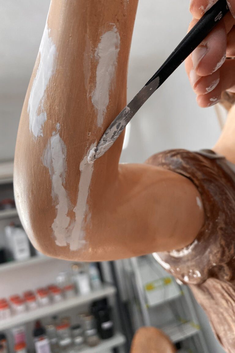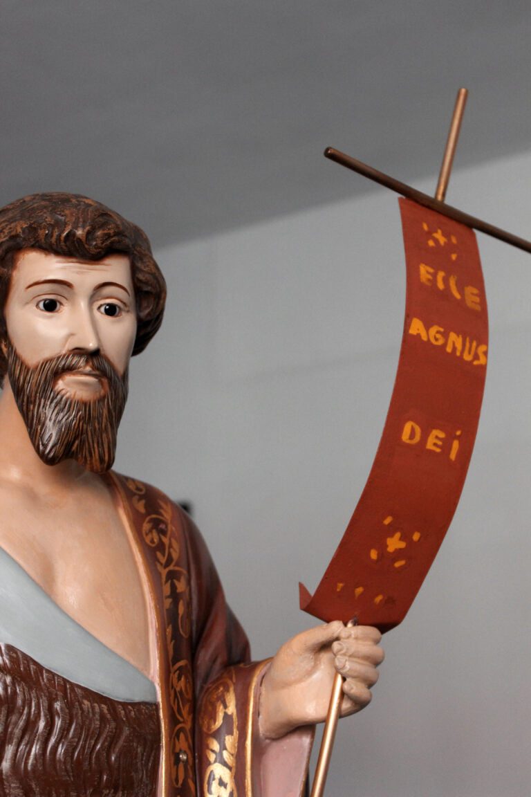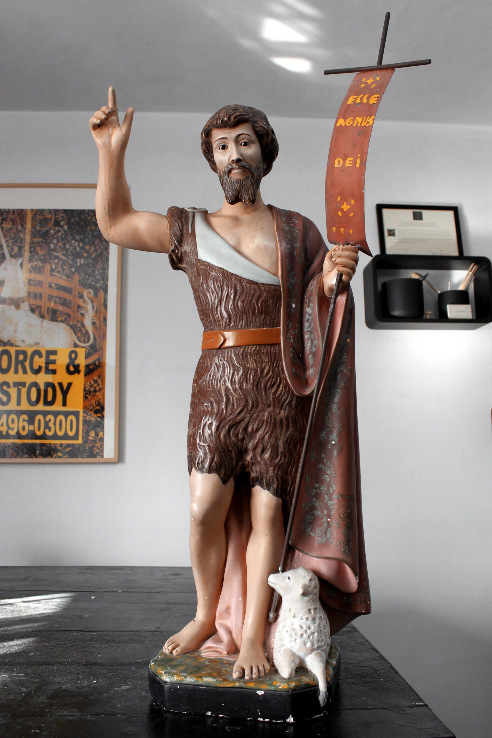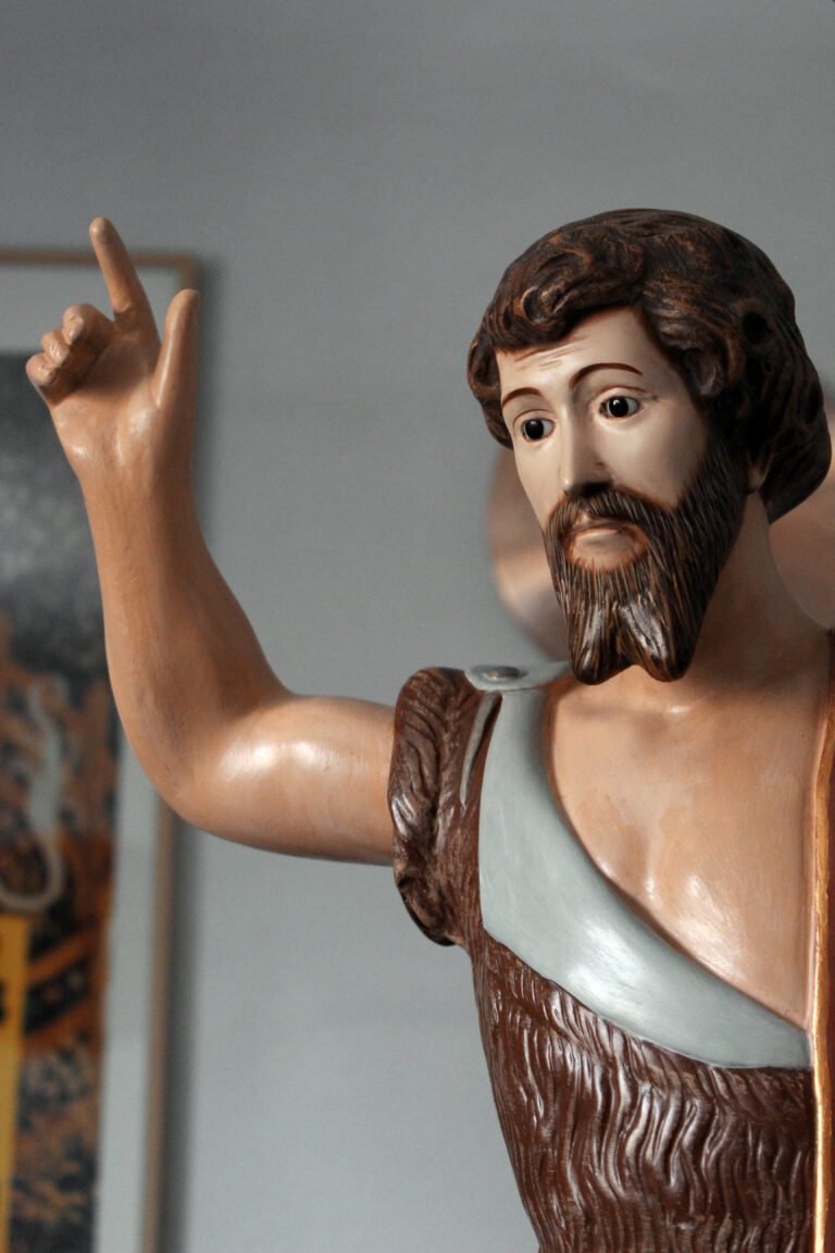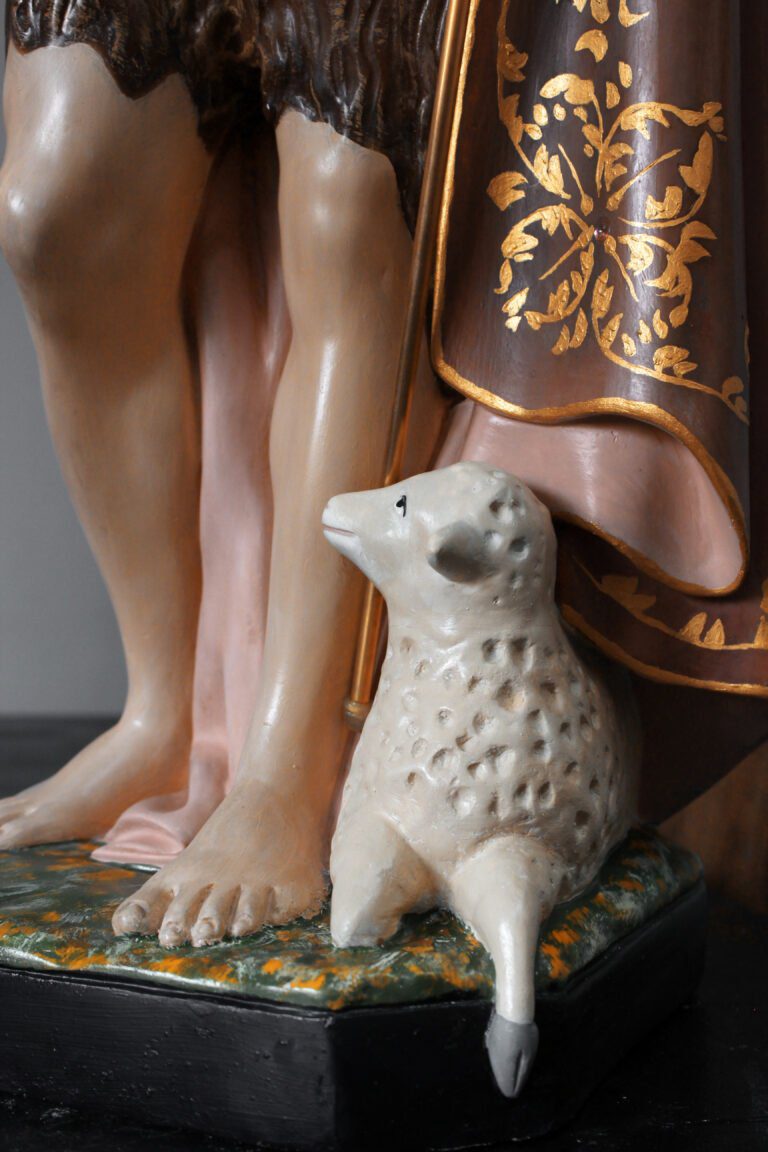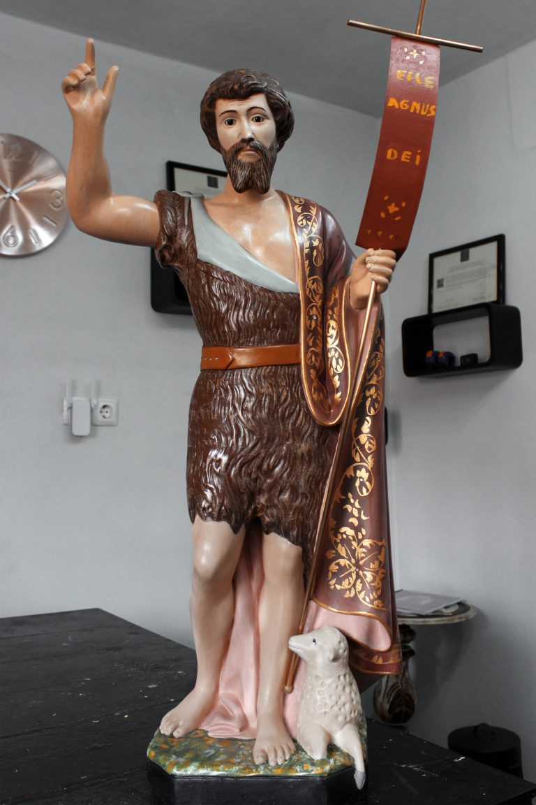 A imagem do São João Batista constituído por gesso, proveniente de uma capela da diocese de Braga, apresentava nomeadamente problemas a nível superficial. De destacar são as intervenções posteriores ao original onde ocorreu uma tentativa de unir um dedo fraturado com um adesivo sintético de secagem rápida. O mesmo provocou diversas escorrências degradando toda esta superfície. Poderá ainda destacar-se a