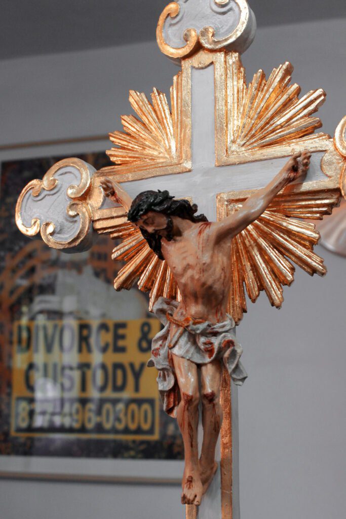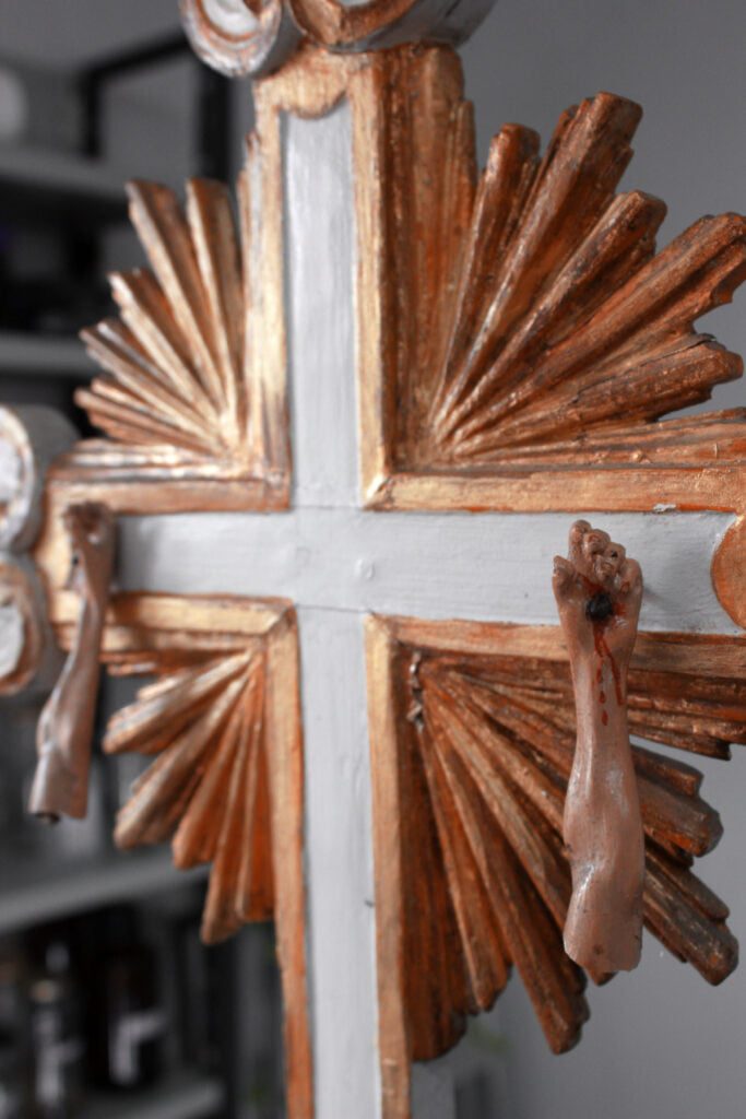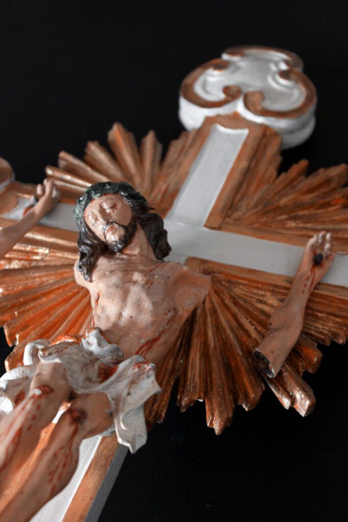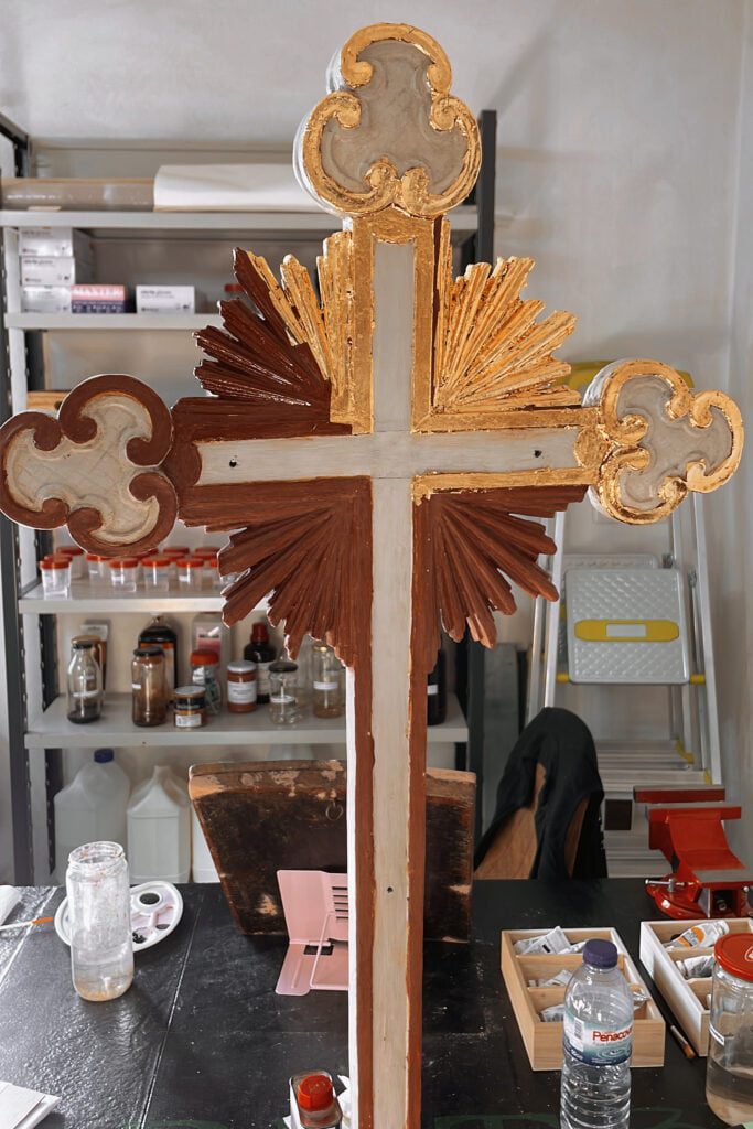 A escultura de madeira do Cristo Crucificado proveniente de uma capela da diocese do Porto sofreu uma intervenção de conservação e restauro. Após uma intervenção realizada de forma incorreta há uns anos por outros colegas foi necessário voltar a intervencionar a imagem. A nível do suporte foi devolvida a estabilidade estrutural da imagem através da reconstrução de um pé da cruz que se apresentava em falta assim como à realização de uma nova união entre os braços do Cristo e o tronco. Os repintes realizados anteriormente também foram removidos e foi aplicada uma folha metálica de forma a devolver o aspeto original de todo o conjunto.