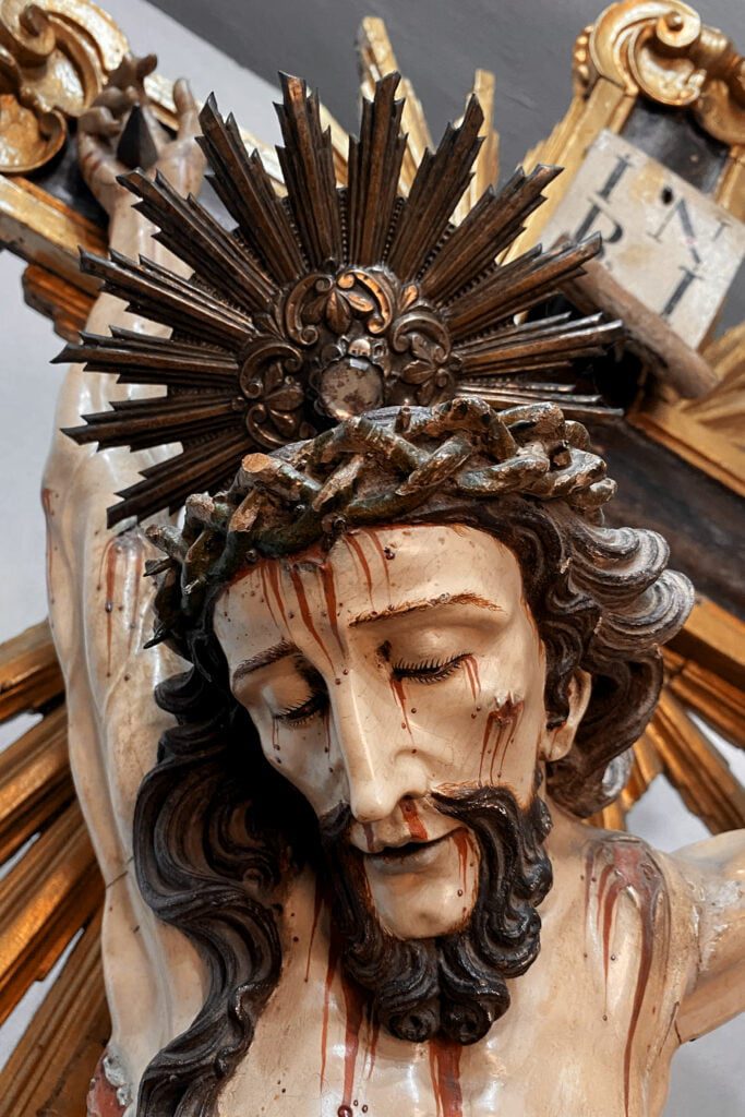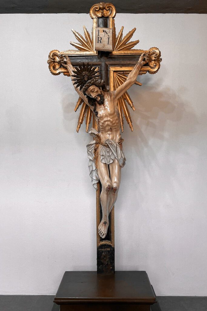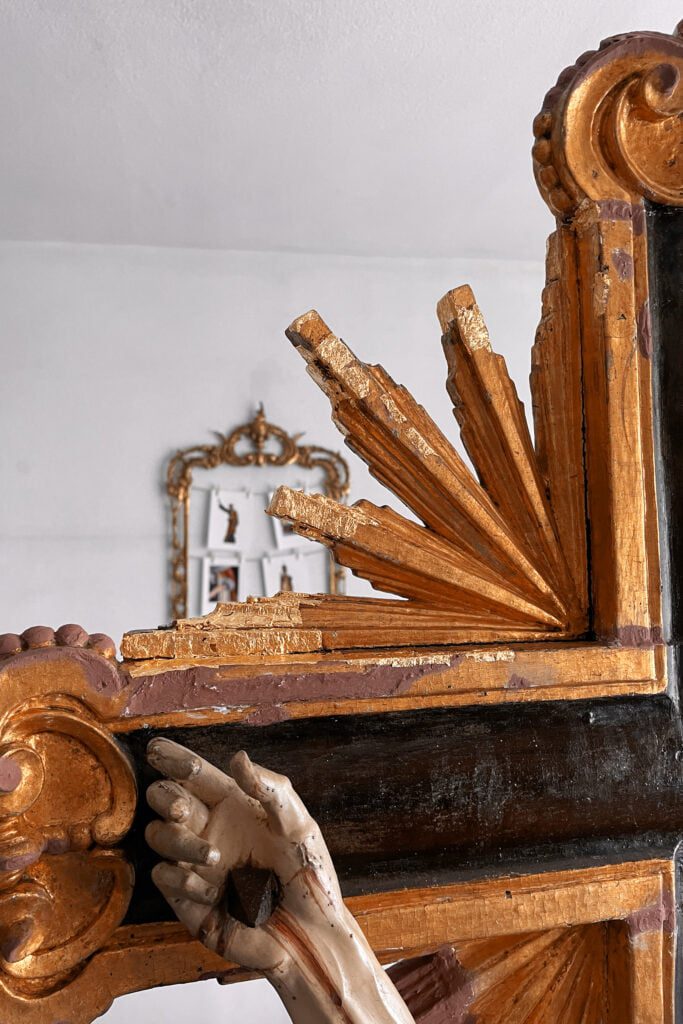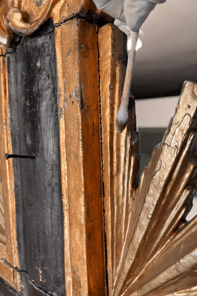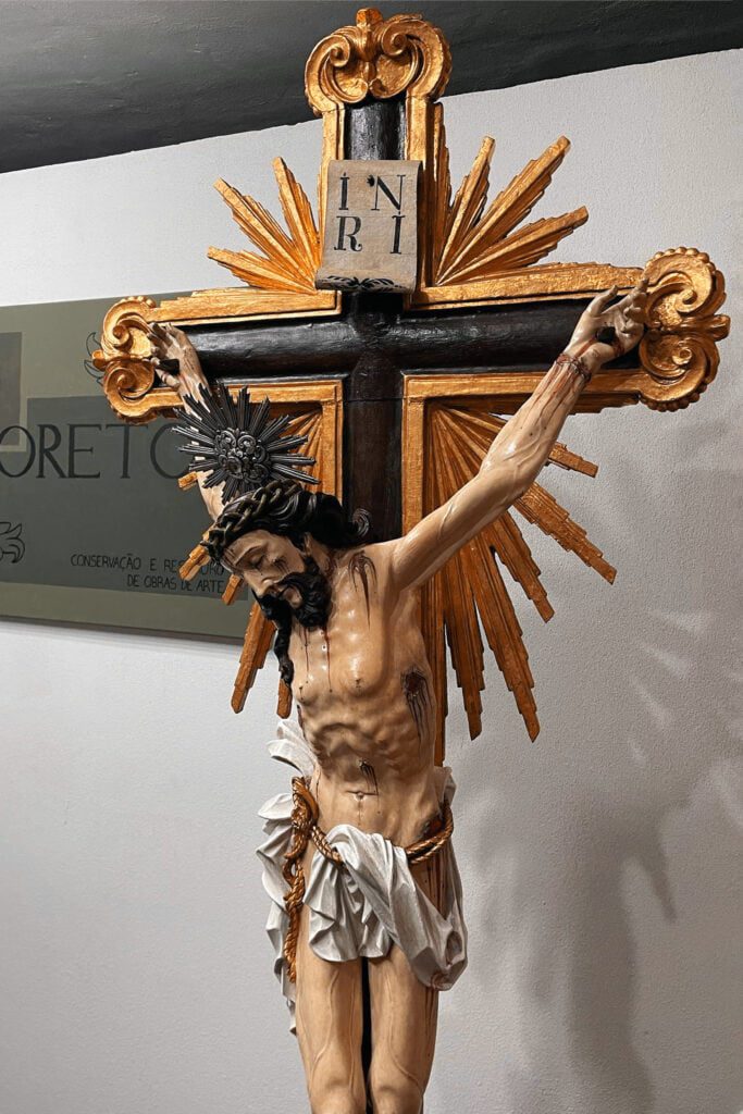 Realizamos uma intervenção de conservação e restauro de um Cristo Crucificado proveniente da mesma paróquia da Nossa Senhora de Lurdes. A intervenção na imagem com suporte de madeira foi realizada em oficina destacando-se a reconstrução de elementos em falta através do entalhe assim como o douramento que se seguiu destes mesmos elementos. De ressalvar é a remoção de repintes sobre toda a folha de ouro.