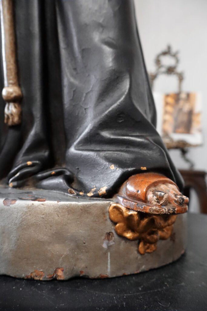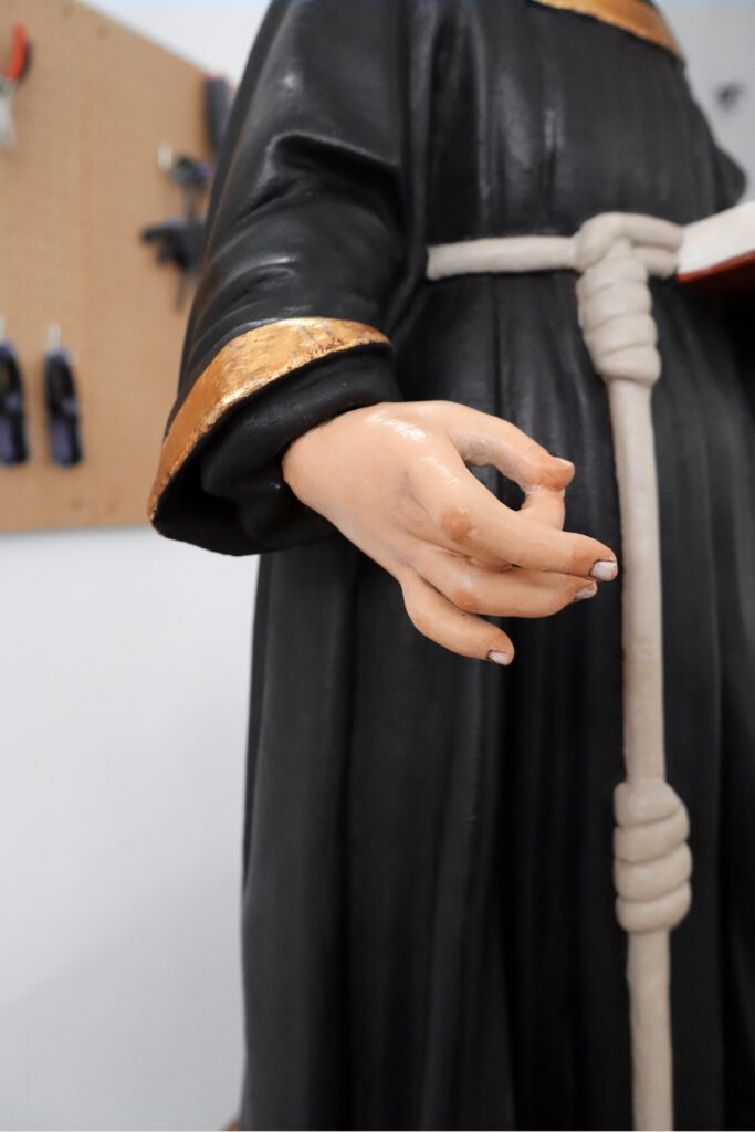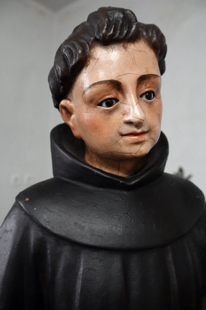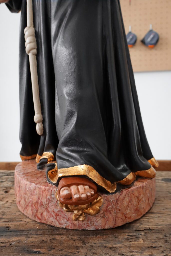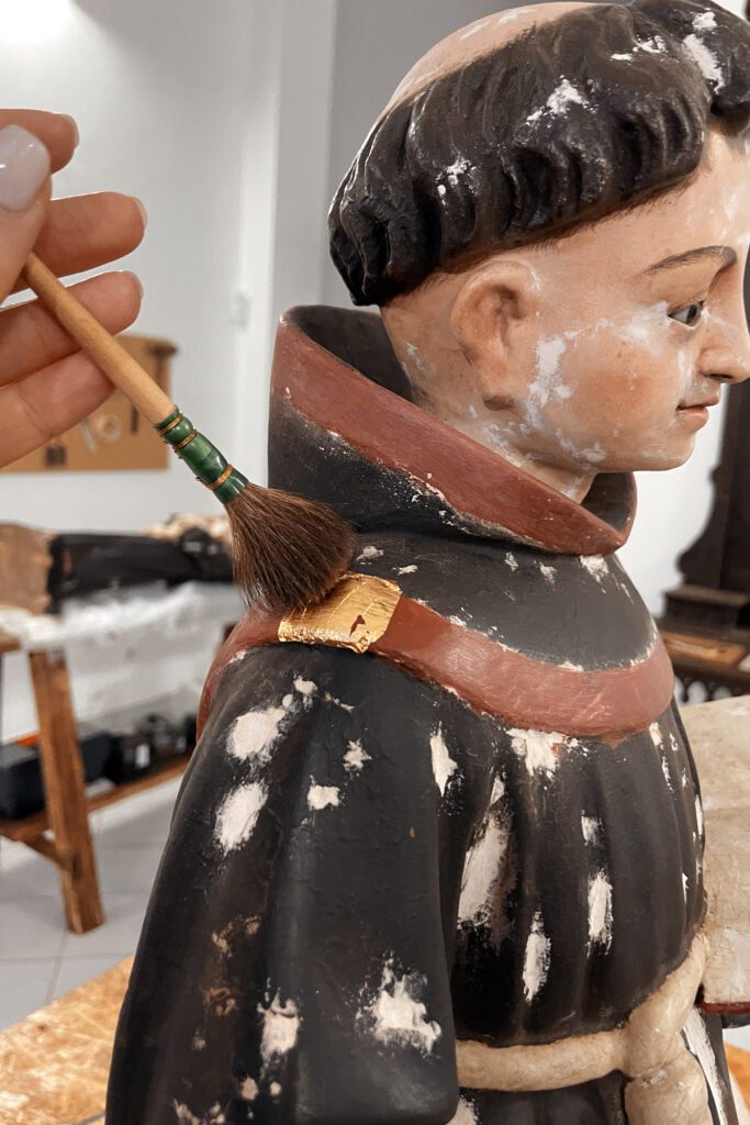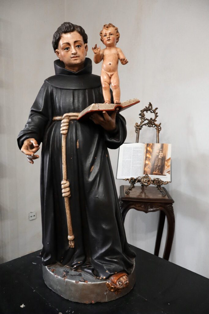 Esta escultura, que é constituída por um suporte lenhoso, sofreu uma intervenção de conservação e restauro. Toda a escultura tinha a sua policromia original oculta por uma repolicromia total. Esta não continha qualquer valor artístico assim como estava a degradar a policromia original que continha folha de ouro fina. Desta forma, foi realizada o levantamento deste repinte de forma a devolver o aspeto visual original, de destacar nomeadamente na base. Esta escultura também apresenta a auréola em falta. Contudo, no tardoz do hábito franciscano existiam as perfurações da mesma e a iconografia também retrata o uso de uma auréola. Desta forma, foi realizada uma reconstituição da auréola original, idêntica tanto na forma como na cor, com a utilização de um metal estável.