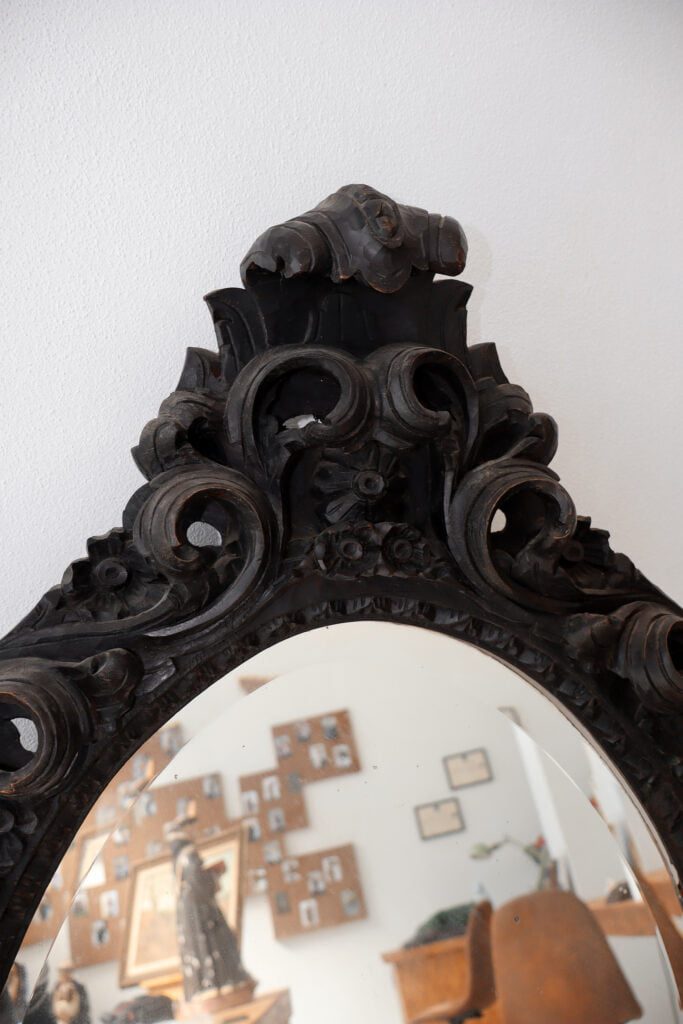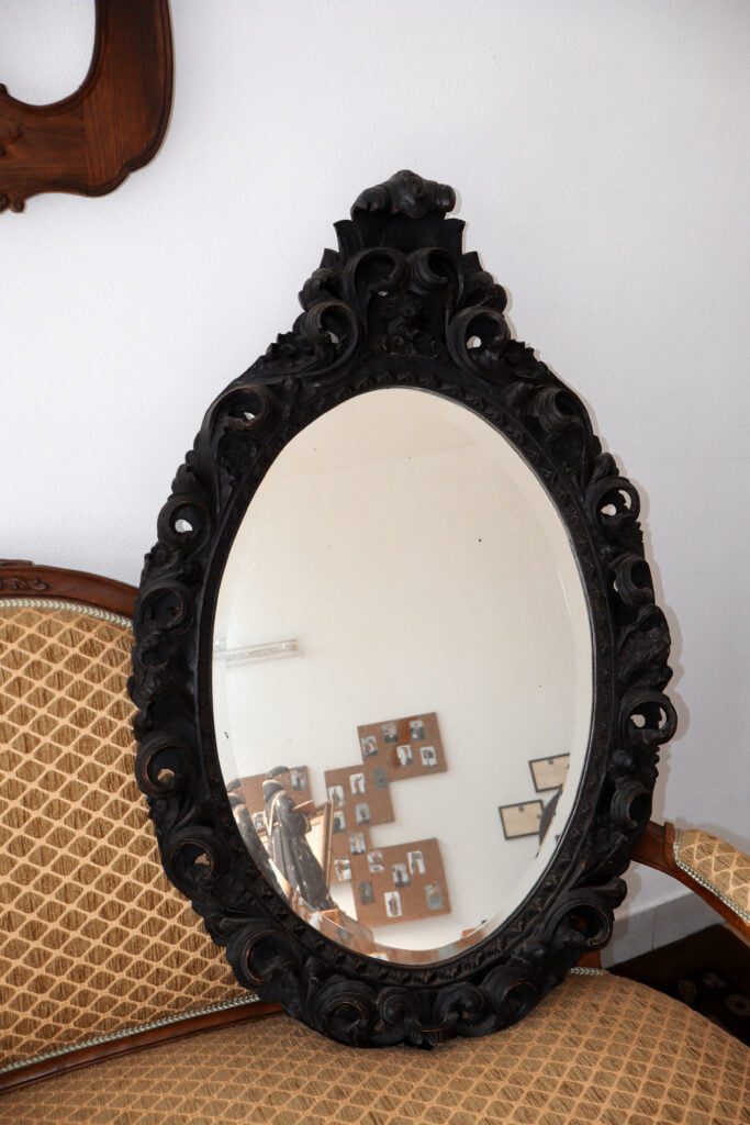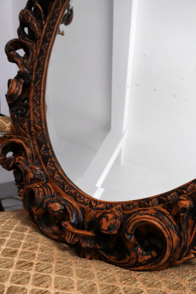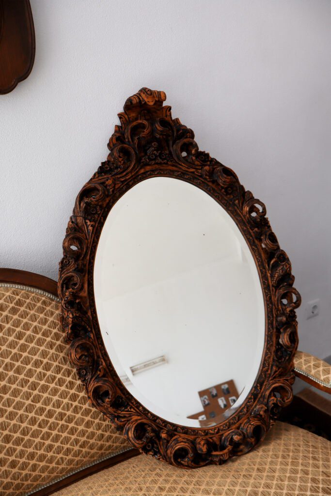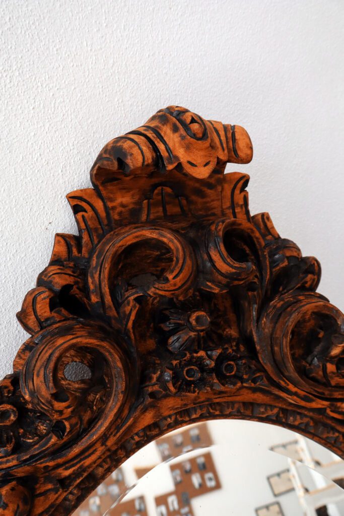 Este espelho de parede sofreu uma intervenção de restauro onde se alterou nomeadamente o seu aspeto. Com esta intervenção pretendeu-se clarear a tonalidade da madeira criando este efeito “manchado”. Para tal, optou-se então pela aplicação do papel abrasivo de diversas granulometrias de forma a retirar a cera presente na superfície, criando então o efeito anteriormente referido. Para concluir, foi aplicado um revestimento final de proteção de forma a devolver a tonalidade original do suporte lenhoso.