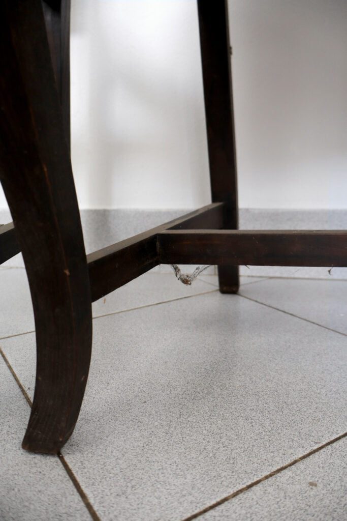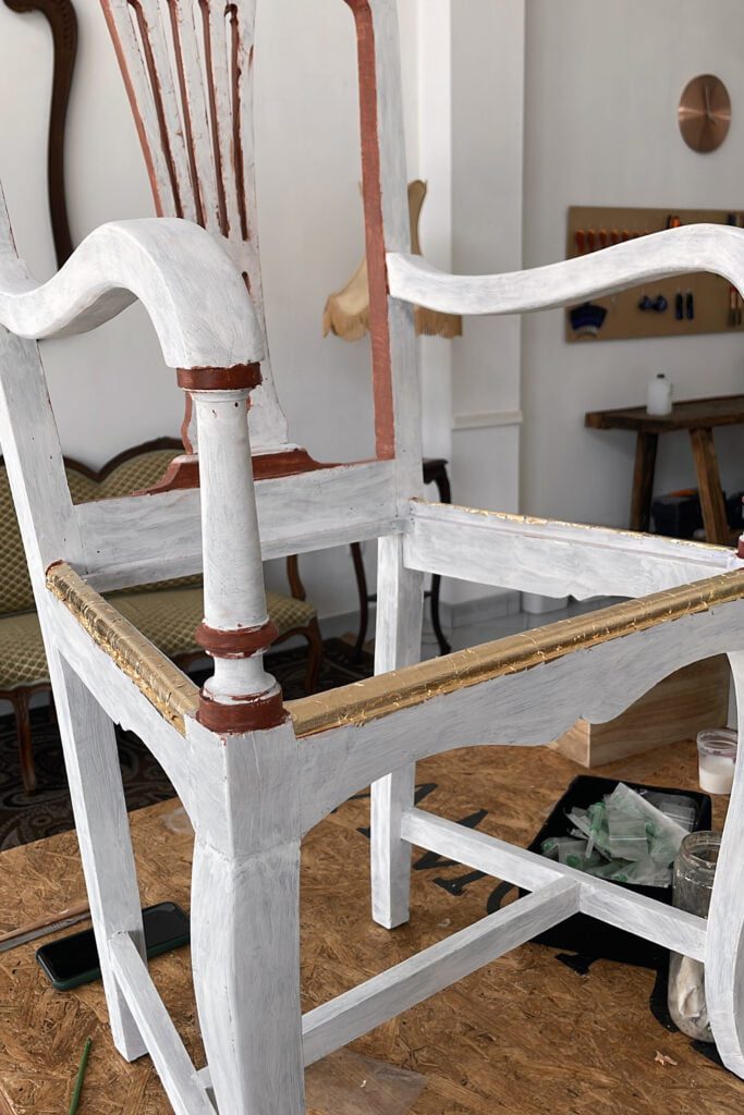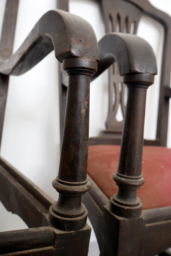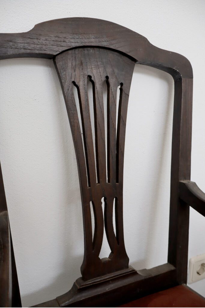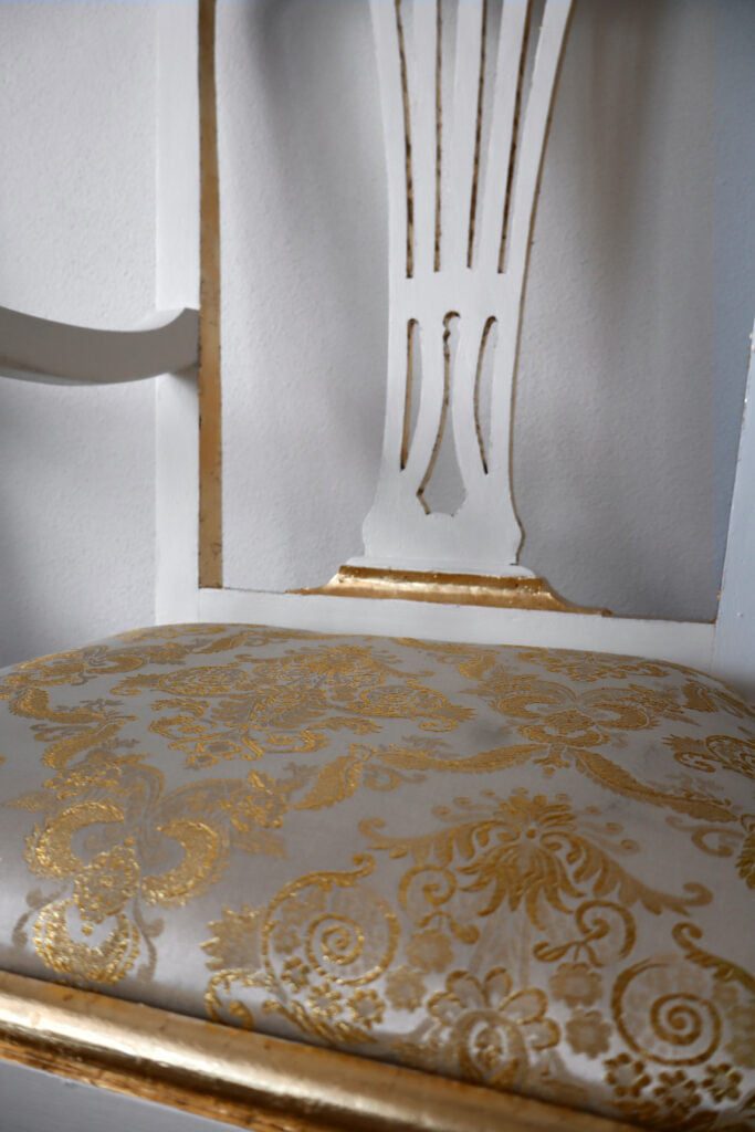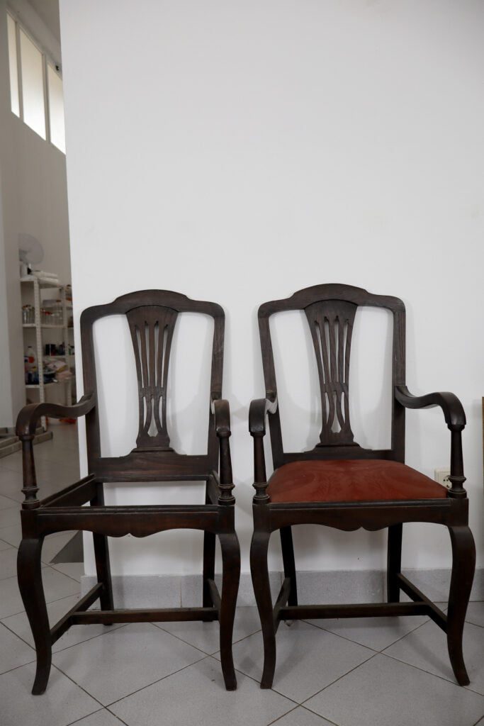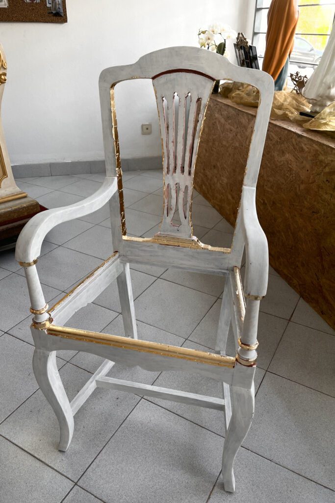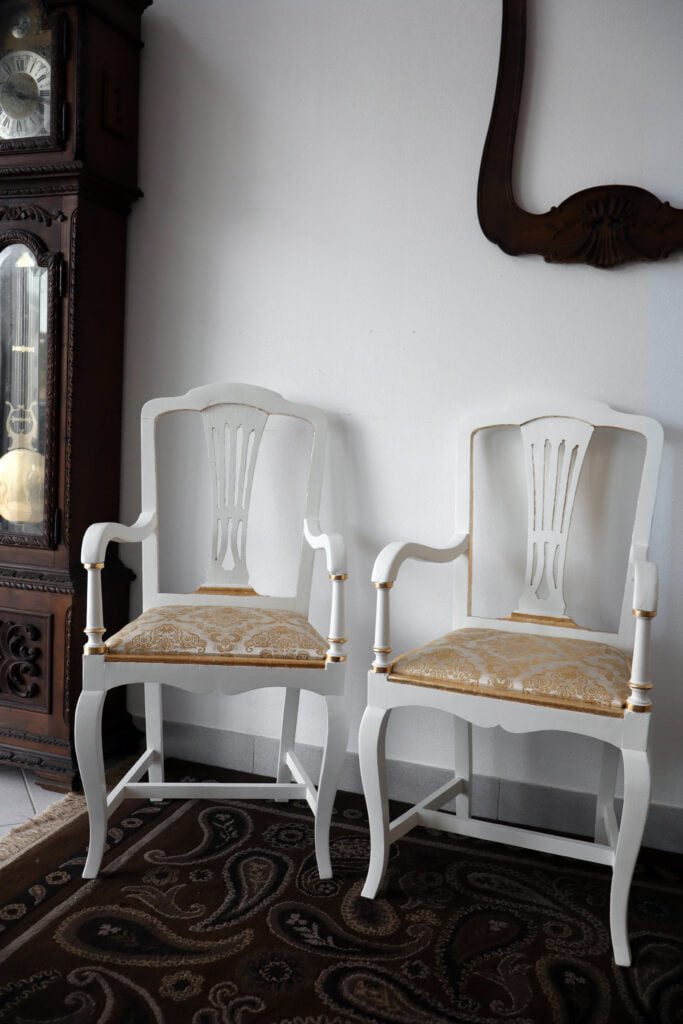 Ambas as cadeiras foram-nos entregues com o propósito de as alterar visualmente. Contudo, foram realizados inicialmente os trabalhos de estrutura que se basearam na desinfestação e consolidação do suporte lenhoso assim como na realização de dois novos assentos, sendo que um já se apresentava em falta. Os mesmos foram igualmente estofados com um tecido brocado. Sobre o suporte e após a utilização do papel abrasivo foram aplicadas diversas camada de preparação brancas assim como a aplicação de camada de bolus da arménia para a posterior receção da folha dourada. Nas restantes áreas que não receberam a folha foi aplicada uma tonalidade escolhida pelo cliente. Para finalizar, foi aplicado um revestimento final de proteção que, simultaneamente, tonalizou a folha dourada.