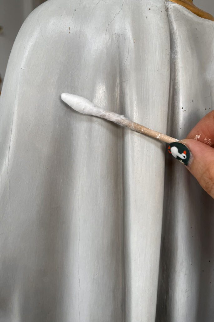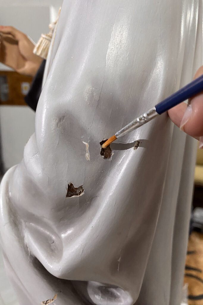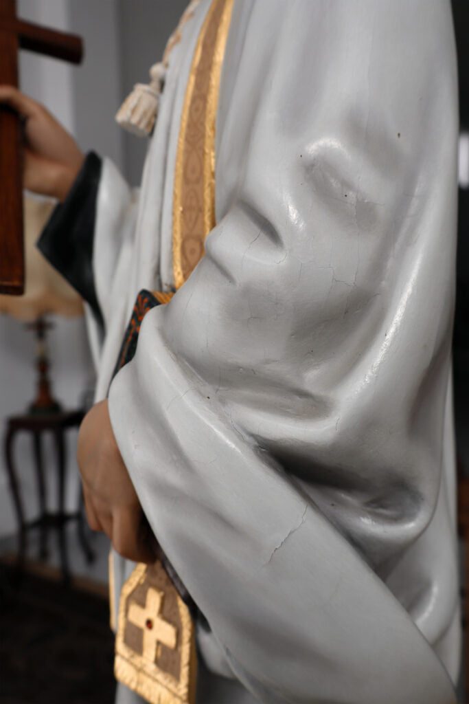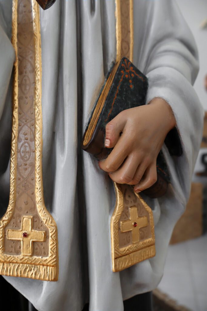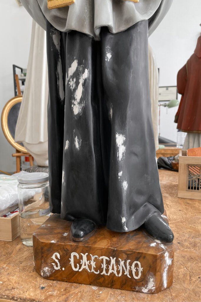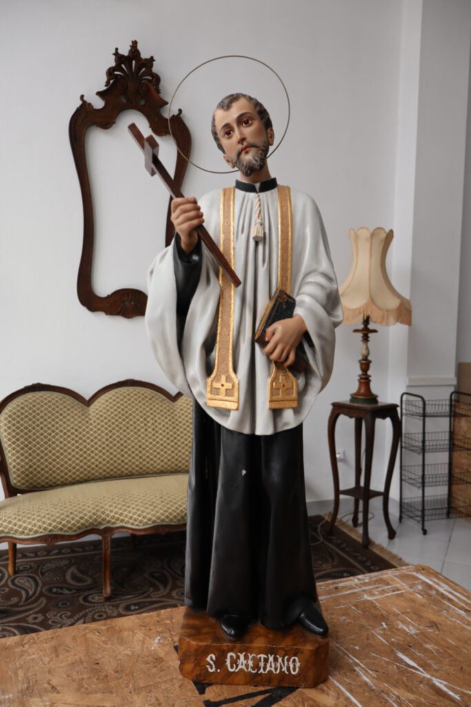 Esta imagem do São Caetano é o padroeiro de um santuário no norte de Portugal, perto da fronteira com Espanha. A escultura chegou à oficina para a realização de uma intervenção de conservação e restauro. Esta imagem apresentava alguns destacamentos, intervenções posteriores ao original assim como um método incorreto de fixação da figura ao andor. Como tal, foi realizada a limpeza química em que também removemos as intervenções posteriores ao original, o método de fixação ao andor foi alterado e, portanto, melhorado. Os destacamentos foram fixados com um adesivo, foram aplicadas massas de preenchimento e, por fim, foram realizadas as reintegrações cromáticas de forma a unificar toda a superfície desta imagem do São Caetano.