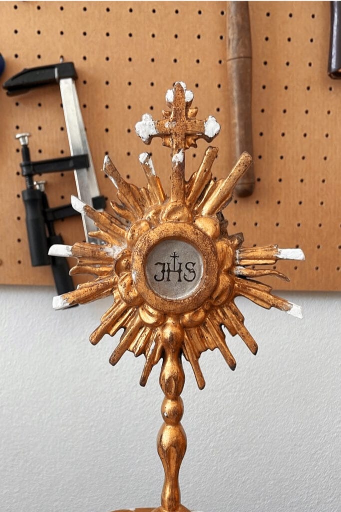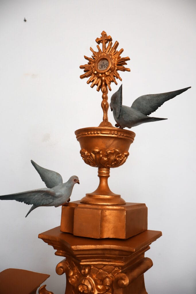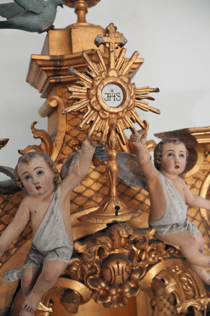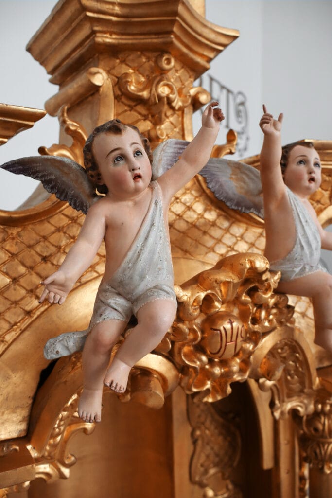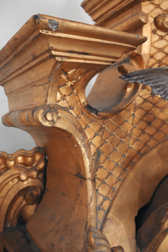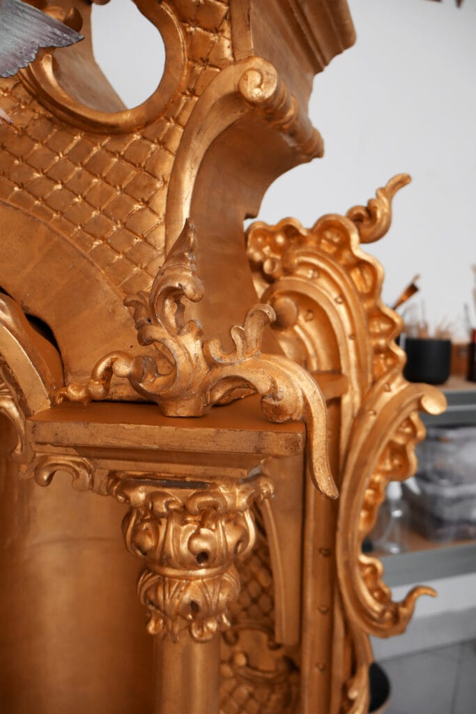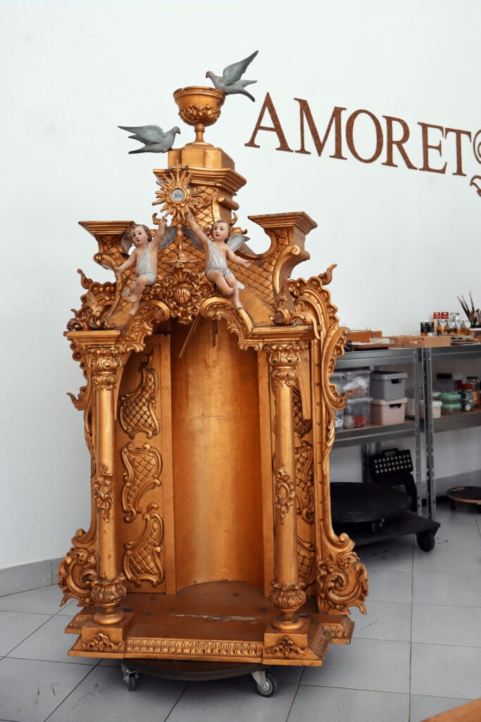 Este baldaquino chegou à oficina com o propósito de realizar uma intervenção de conservação e restauro. Este elemento apresentava elementos fraturados e perdidos, elementos mal localizados, áreas queimadas, também apresentava ataque xilófago, entre outras patologias. Desta forma foi realizada uma desinfestação seguida de uma consolidação de forma a devolver a coesão interna ao suporte lenhosos. As áreas fraturadas oram reconstituídas e foi aplicada folha de ouro fina de 24K nas áreas onde a mesma se apresentava em falta. Em relação aos elementos policromados estes foram limpos quimicamente, como o restante baldaquino também, foram aplicadas massas de preenchimento e foram reintegrados cromaticamente através de uma técnica mimética.
