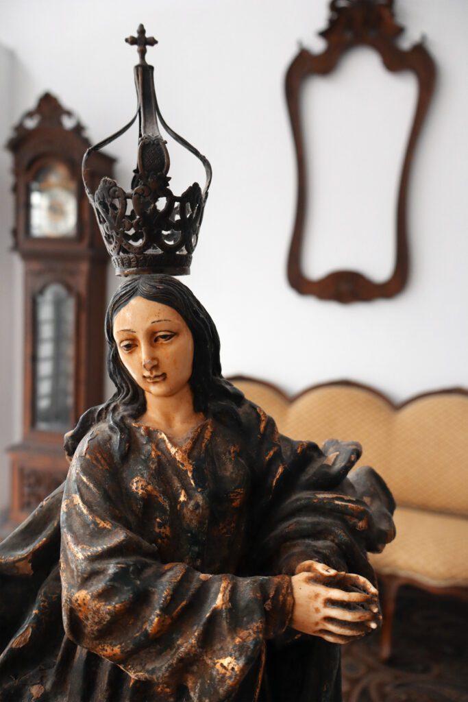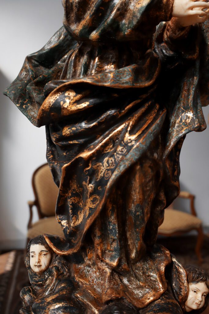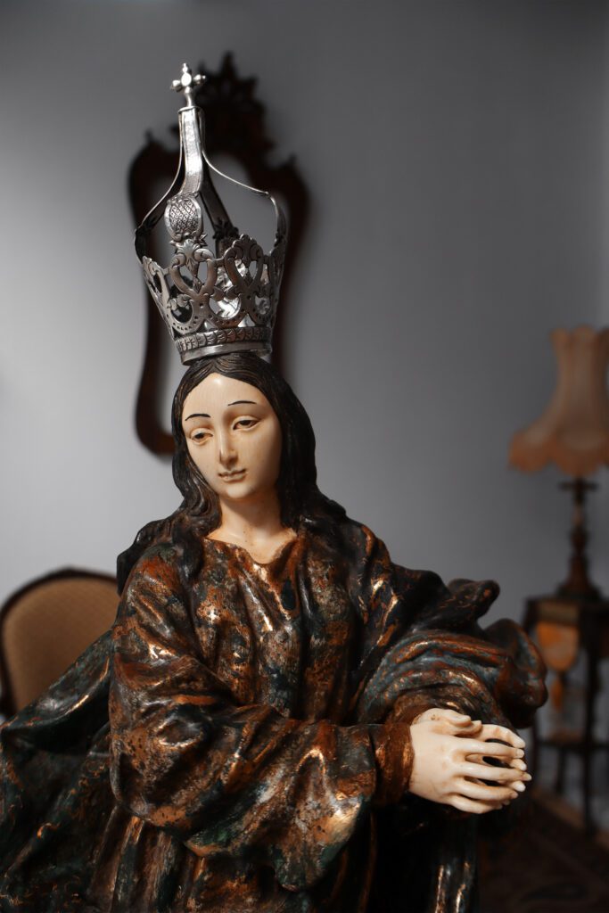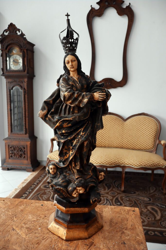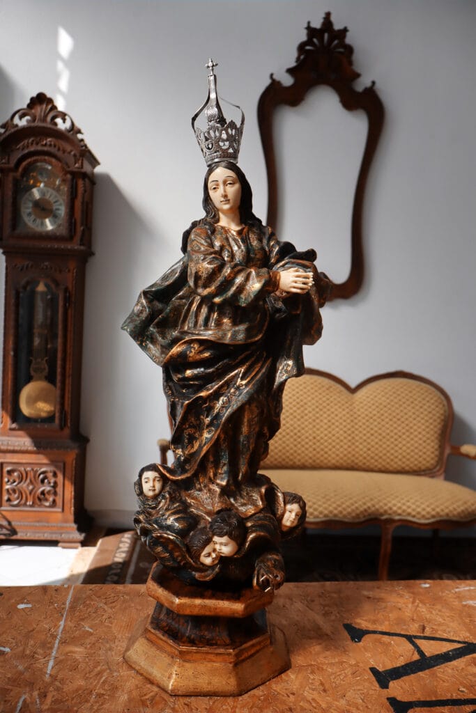 A imagem da Imaculada Conceição foi intervencionada em oficina. Esta escultura é constituída por madeira e marfim. Toda a policromia com folha de ouro apresentava-se com diversos destacamentos, áreas fissuradas, a coroa apresentava-se oxidada, entre outras patologias. Desta forma foi realizada uma limpeza química tanto na policromia como no marfim, foram preenchidas as fissuras, a coroa foi limpa através de métodos mecânicos e a policromia foi reconstruída através da técnica de tratteggio.