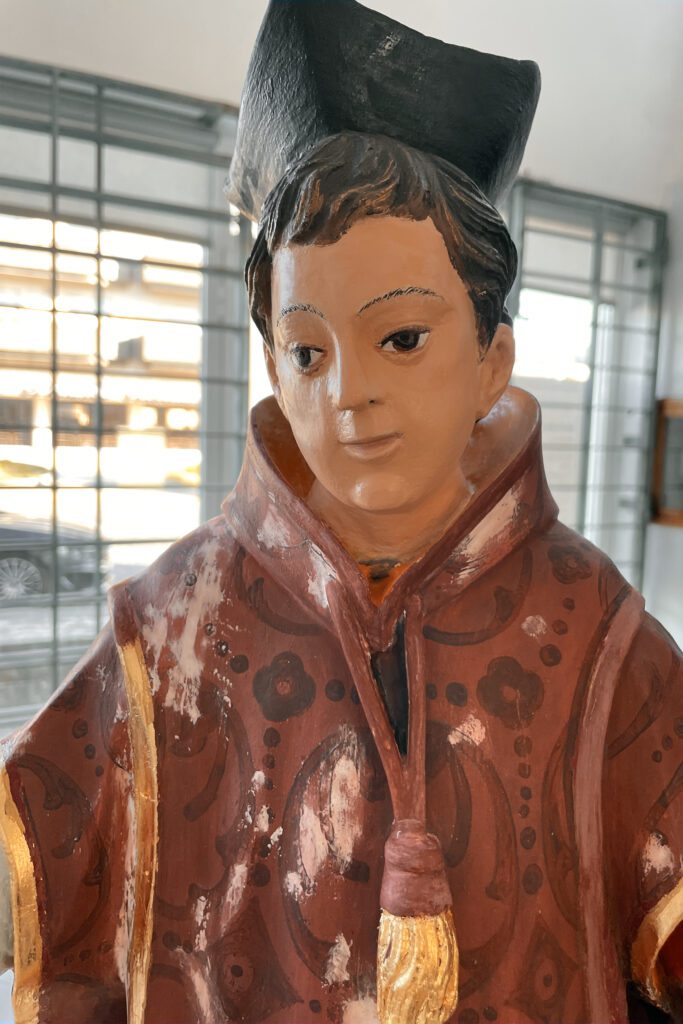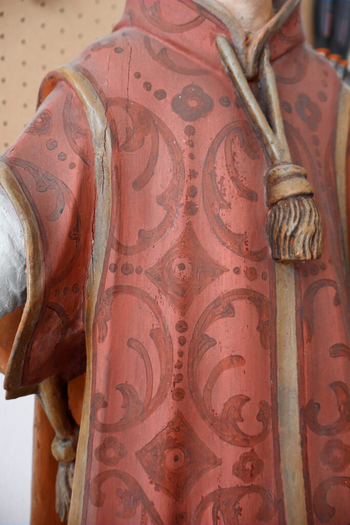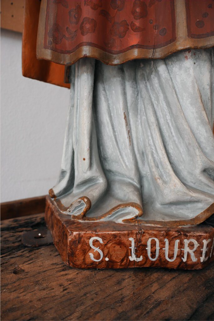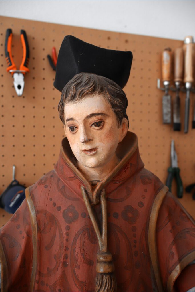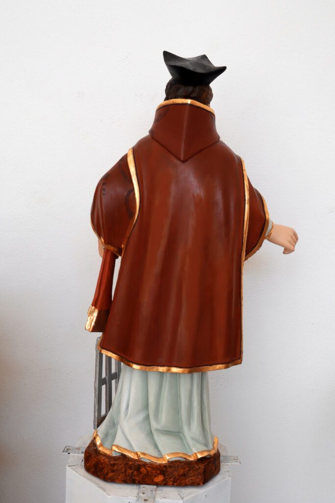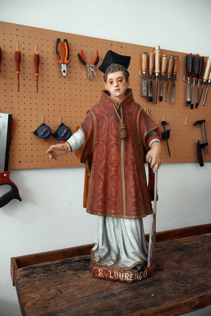 Esta escultura do São Lourenço é proveniente de uma capela e chegou à oficina para uma intervenção de conservação e restauro. Esta imagem foi bastante repintada, nomeadamente sobre a folha de ouro original, nas carnações e no manto vermelho. Nas carnações foi possível remover este repinte e nas áreas que originalmente existia folha de ouro foi aplicada novamente visto que o original já não se encontrava presente. Foram também realizadas algumas reintegrações cromáticas e a aplicação de um verniz final de forma a proteger contra os fatores externos.