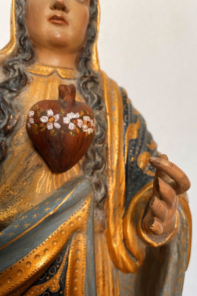 Esta imagem do Sagrado Coração de Maria, proveniente de uma capela da diocese do Porto, apresentava nomeadamente patologias a nível da camada cromática. Das quais poderá destacar-se a abrasão que degradou os brocados presentes nas vestes do Sagrado Coração de Maria. A imagem também continha fraturas no suporte lenhoso sendo que, posteriormente, ocorreram a perda de alguns dos dedos da imagem, que durante a intervenção foram reconstruídos e reintegrados cromaticamente, não sendo possível denotar alguma distinção com os originais.